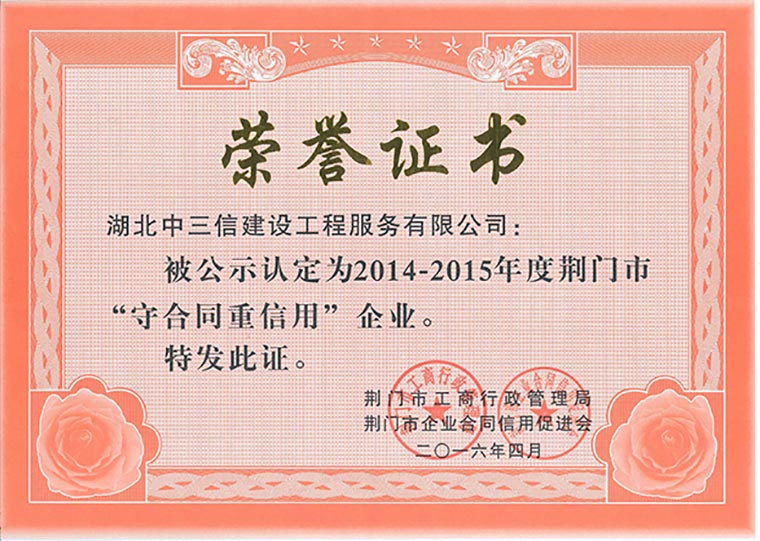 2016年7月,湖北中三信建設(shè)工程服務(wù)有限公司分別榮獲湖北省、荊門市第十三屆“守合同、重信用”榮譽稱號。